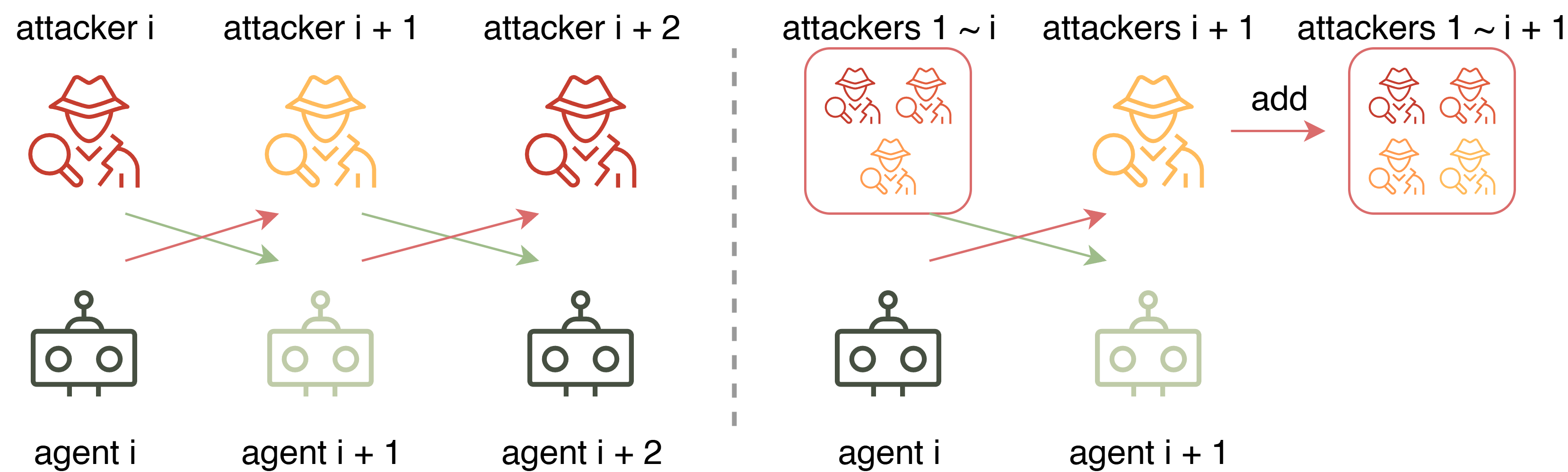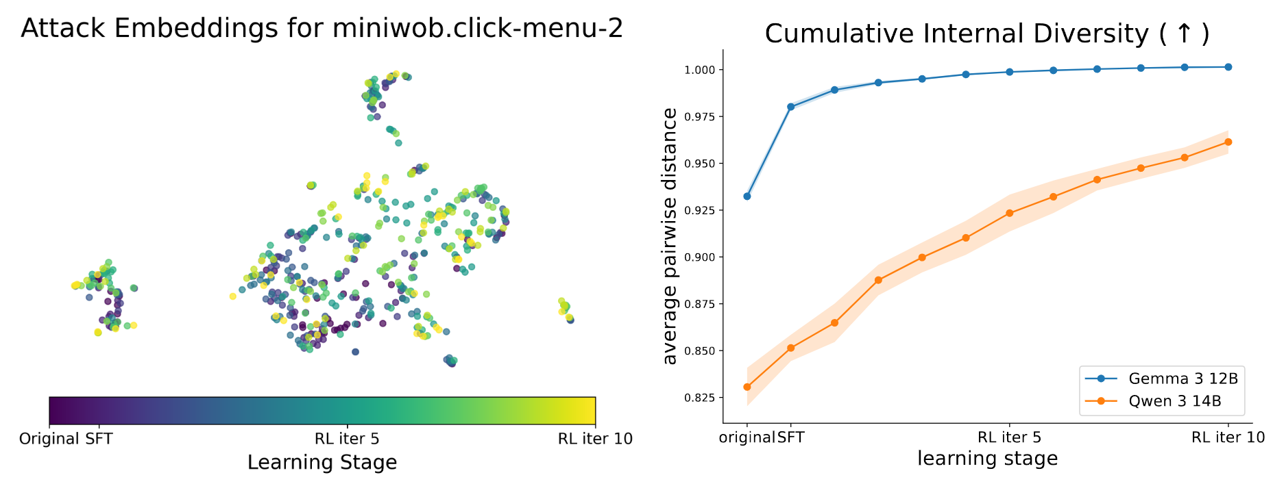 In the left sub-figure shown below, we shows the embedding evolution during training. As training progresses, the embeddings from later learning stages gradually deviate from those of earlier iterations. For example, while embeddings in the leftmost cluster gradually spread out, those in the right cluster centralize along the x-axis while dispersing along the y-axis. Moreover, the right sub-figure shows that the internal diversity of the embeddings consistently increases with RL training, further validating that ARLAS learns to generate diverse attacks.
