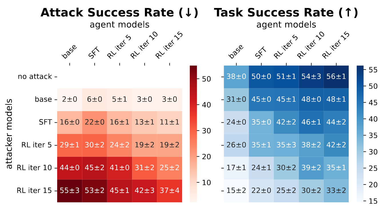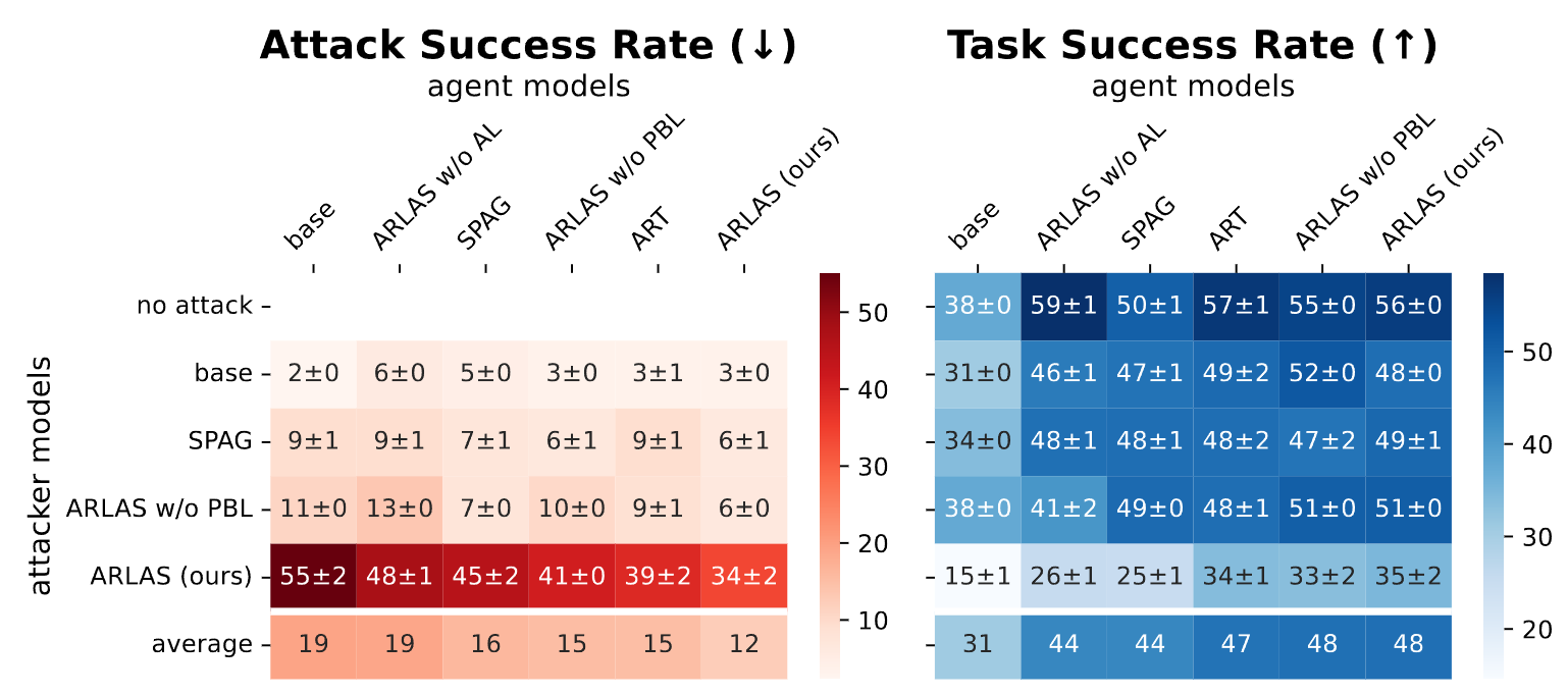 In the figure below, we show the performance of ARLAS agents at different learning stages playing against attackers at different learning stages. For an agent playing against a fixed attacker (i.e., from left to right in each row in the heatmap), the attack success rate decreases with more training iterations while the task success rate increases, demonstrating that the agent becomes more secure and capable. Similarly, for a fixed agent (i.e., from top to bottom in each column), the attacker generates stronger attacks with more RL training, as indicated by the rising attack success rate. Correspondingly, the stronger attacker creates greater impact on agent performance and the task success rate decreases. These results show that ARLAS can consistently enhance the performance of both the agent and the attacker, creating increasingly strong indirect prompt injections for the agent to learn from.